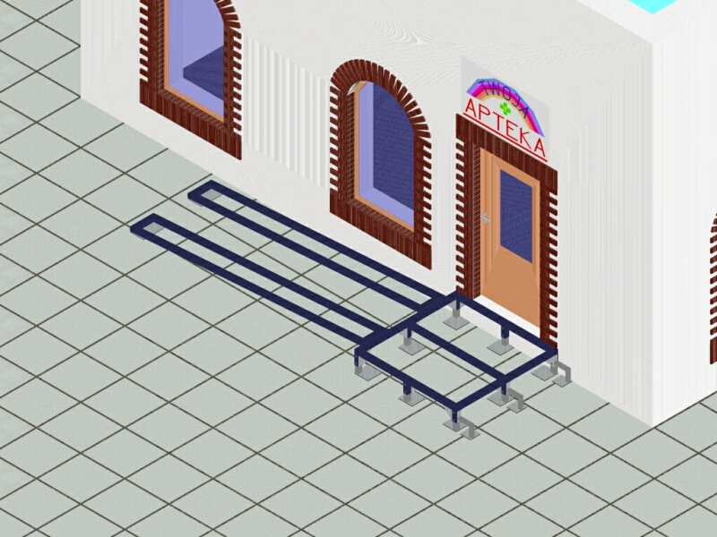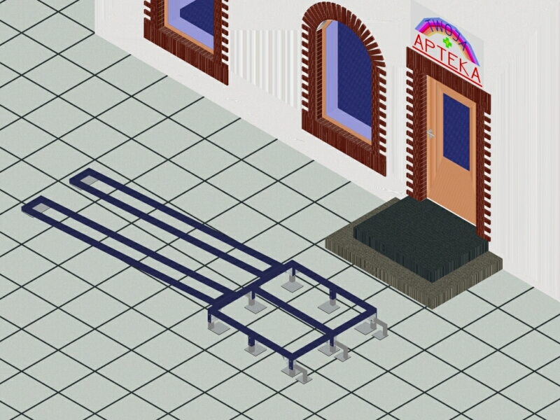 Die zweite Bauphase ist das Aufstellen der Konstruktion, wobei zu beachten ist, dass der Bürgersteig eine Neigung von 2% nicht überschreiten darf. Nach dem Ausrichten wird die Konstruktion mit dem Mauerwerk der Gebäude verschraubt.
